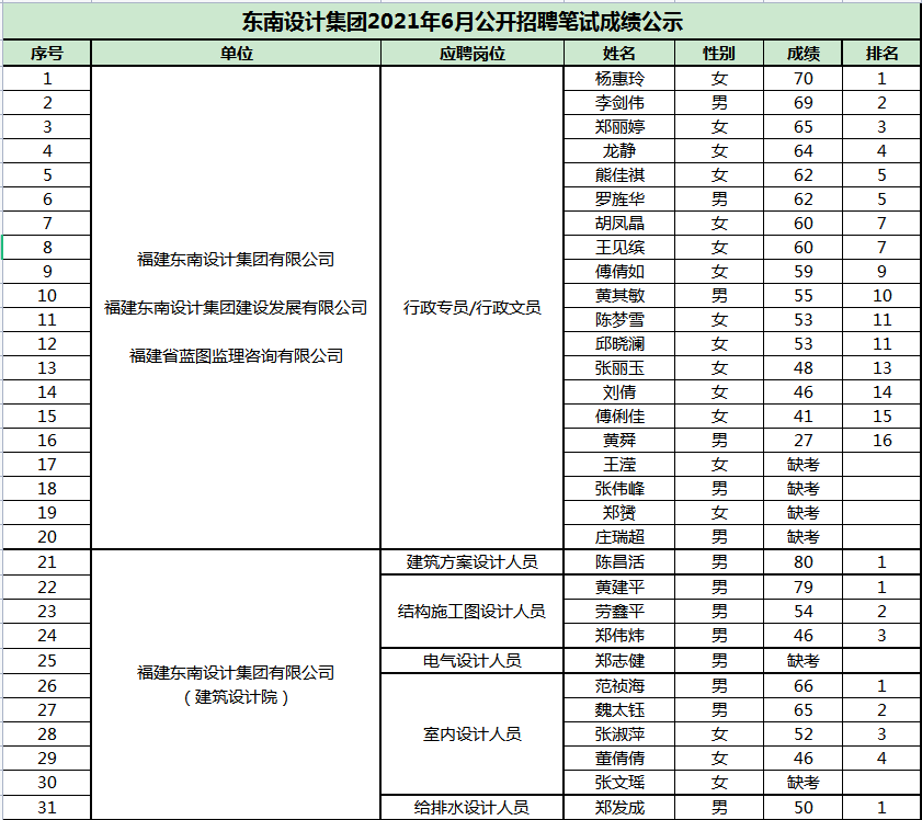 2021年6月公開招聘進入筆試成績公示